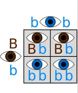اگر ژن قهوهای بودن چشم غالب باشد (B)، و ژن آبی بودن چشم مغلوب باشد (b)، فردی با ژنوتیپ Bb یا BB دارای چشم قهوهای خواهد بود.