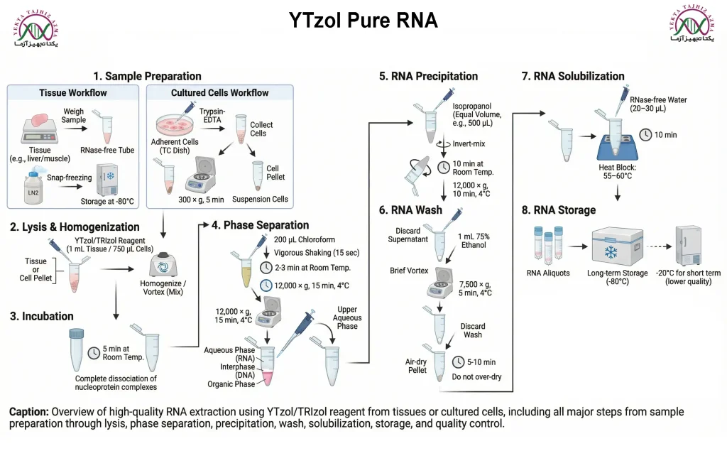 روش TRIzol یکی از روشهای استاندارد استخراج RNA است و YTzol Pure RNA دقیقاً با همین مکانیزم کار میکند.