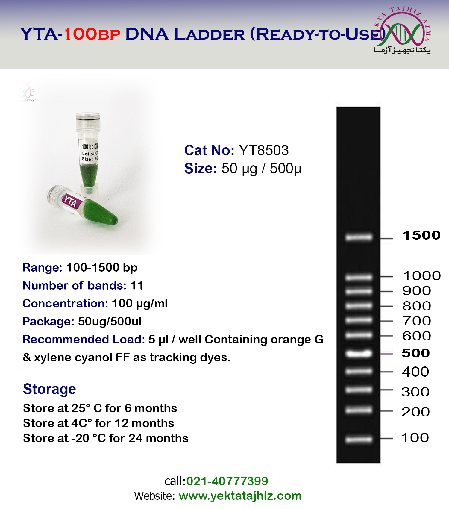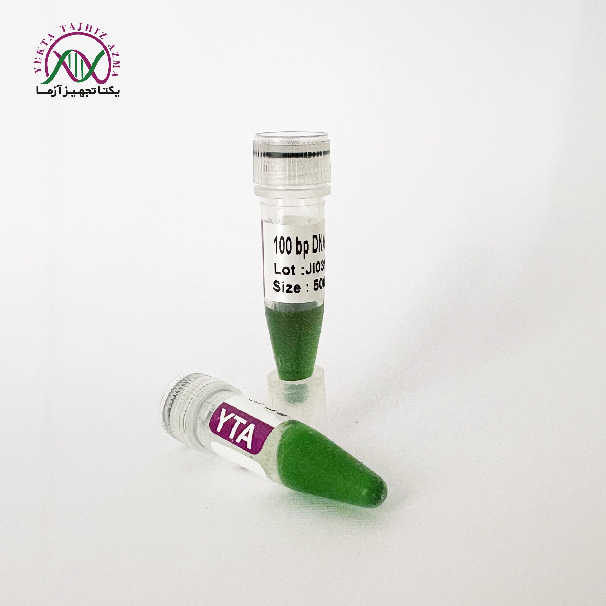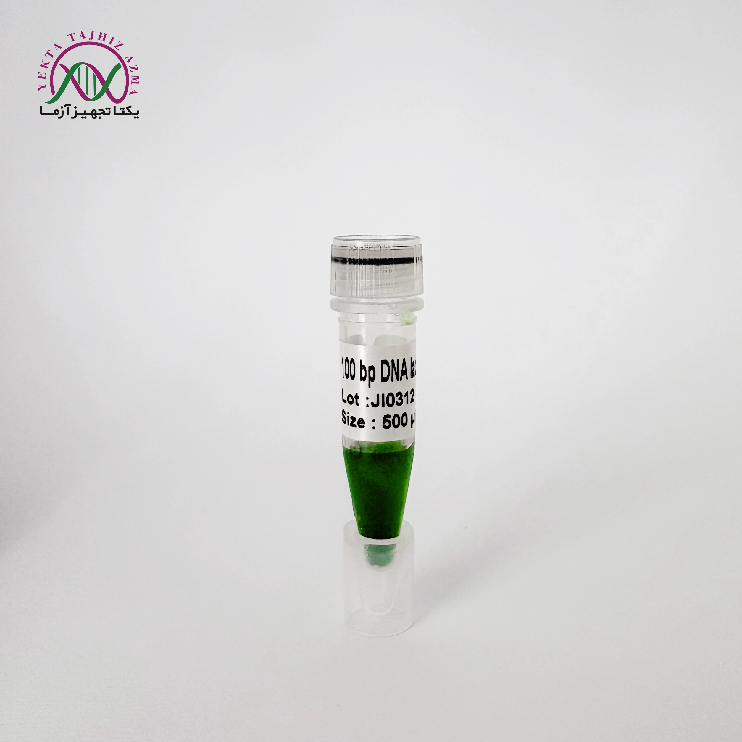 لدر 100bp متشکل از یازده قطعه است که اندازه آنها از 100 جفت باز تا 1000 جفت باز با فواصل 100 جفت باز و یک قطعه در 1500 جفت باز است. 100bp DNA Ladder شرکت یکتا تجهیز، یک مارکر آماده استفاده است که برای بارگذاری مستقیم روی ژل طراحی شده و دارای رنگ است.