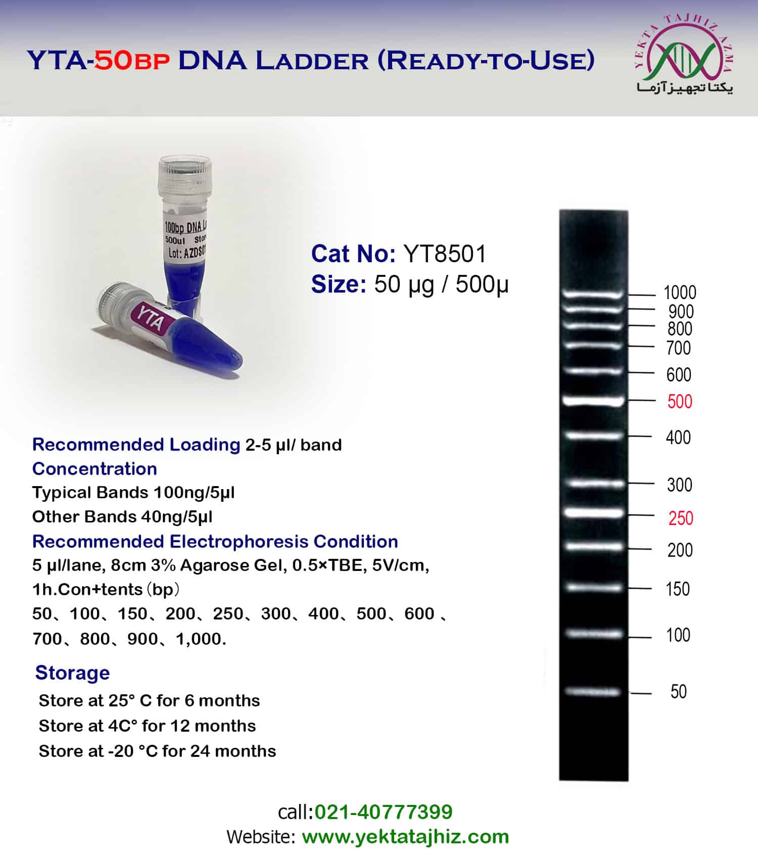لدر 50Bp از 13 قطعه DNA ، شامل قطعاتی از 50 جفت باز تا 1000 جفت باز تشکیل شده است. این 13 قطعه حاصل هضم آنزیمی پلاسمیدهای اختصاصی است که برای استفاده به عنوان استاندارد وزن مولکولی به منظور انجام الکتروفورز ژل آگارز و پلی آکریل آمید تولید می شود . بنابراین با استفاده از این لدر می توانید اندازه و غلظت قطعات DNA حاصل شده توسط PCR یا هضم آنزیمی را تخمین بزنید. .باندهای 250 و 500 به عنوان باندهای مرجع در نظر گرفته شده اند. این نشانگر وزن مولکولی به ویژه برای شناسایی قطعات کوچک DNA طراحی شده است.