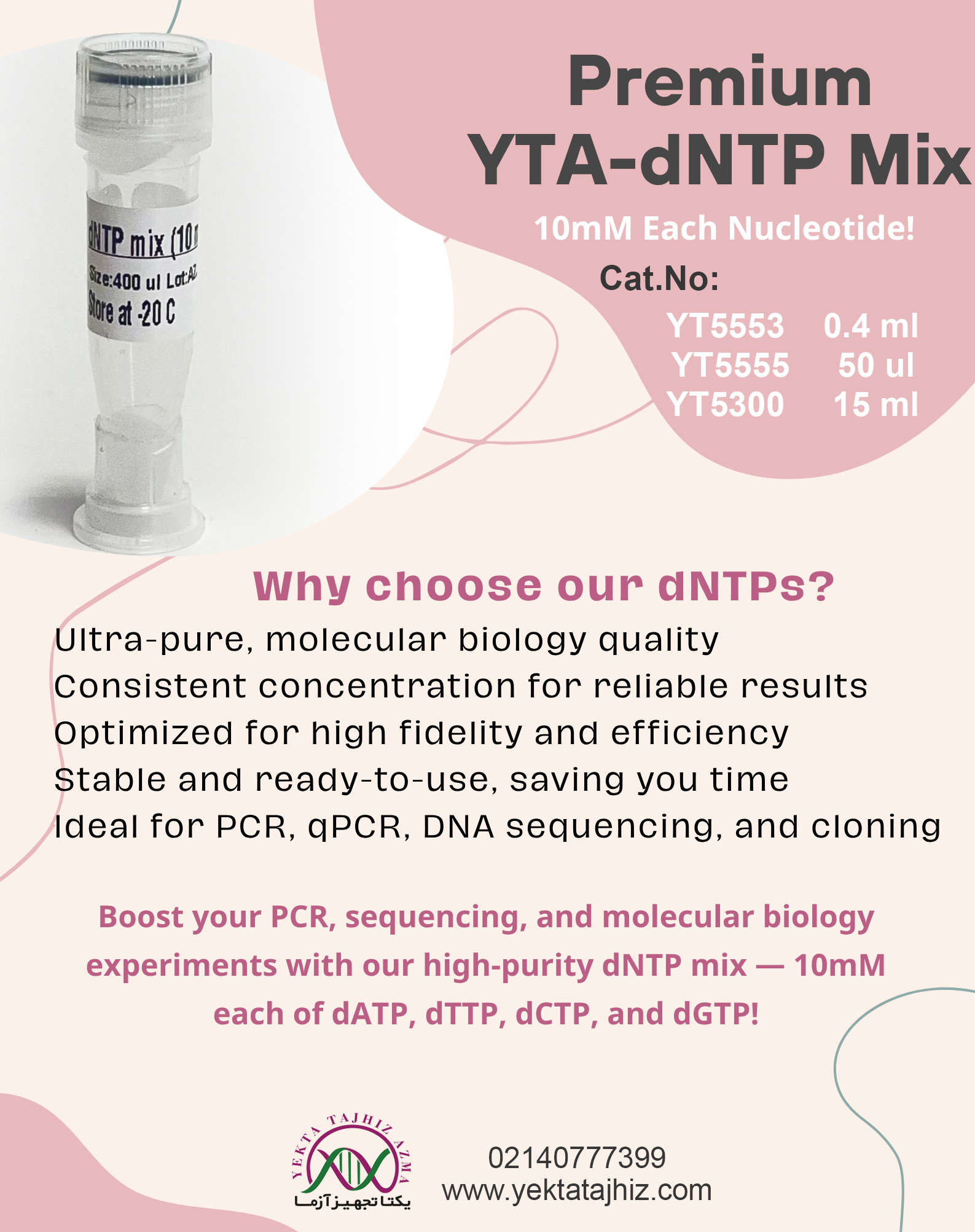 این محصول مخلوطی از چهار نوکلئوتید dATP، dCTP، dGTP و dTTP با خلوص 99.9 درصد می باشد. غلظت کل نوکلئوتیدها 40 میلی مولار و غلظت هر کدام از نوکلئوتیدها در مخلوط 10 میلی مولار می باشد. استفاده از مخلوط dNTP منجر به کاهش آلودگی و احتمال خطا در آزمایش می شود. شما می توانید از dNTP mix در تمام آزمایشات زیست شناسی مولکولی استفاده کنید. از نظر عملکردی در PCR با DNA پلیمرازهای Taq و Pfu آزمایش شده است.این محصول به صورت بالک و در حجم 15ML نیز عرضه می گردد
